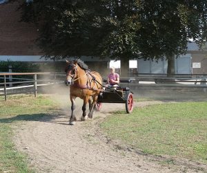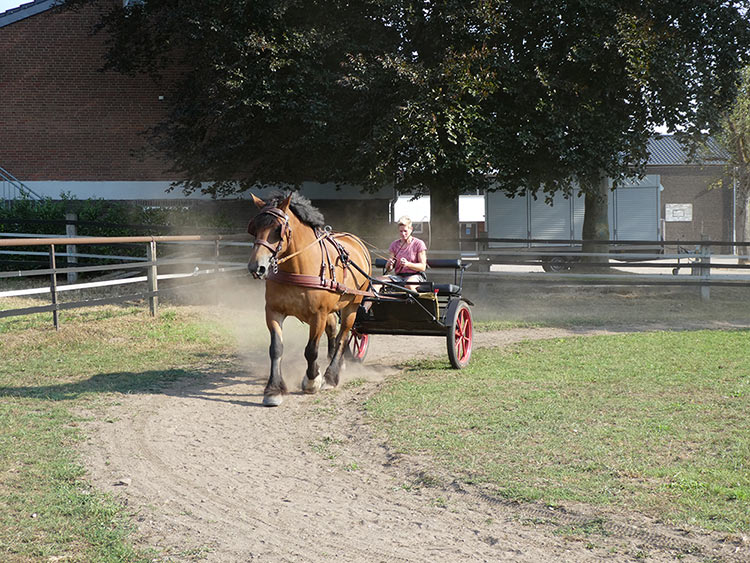 Auch im Herbst gibt’s Arbeit für RHDK „Alyessa“. Sie geht fit im Wagen und pflegt gleichzeitig die Reitbahn.