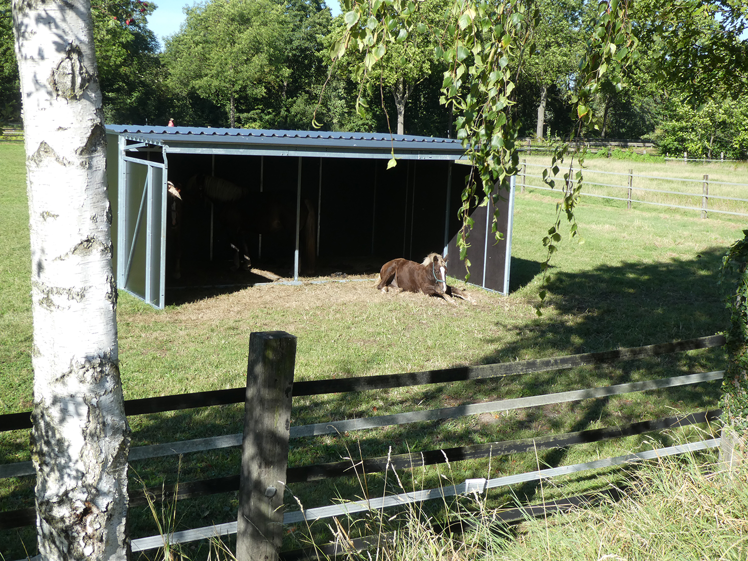 Anfang September : Dank des guten Wetters und einer schönen großen Schutzhütte können die Stuten mit Fohlen nachts draußen schlafen.Damit sie nicht aus der Übung kommt geht unsere 4-jährige SW Stute „Ruby“ mal in der Kutsche,mal wird sie geritten.