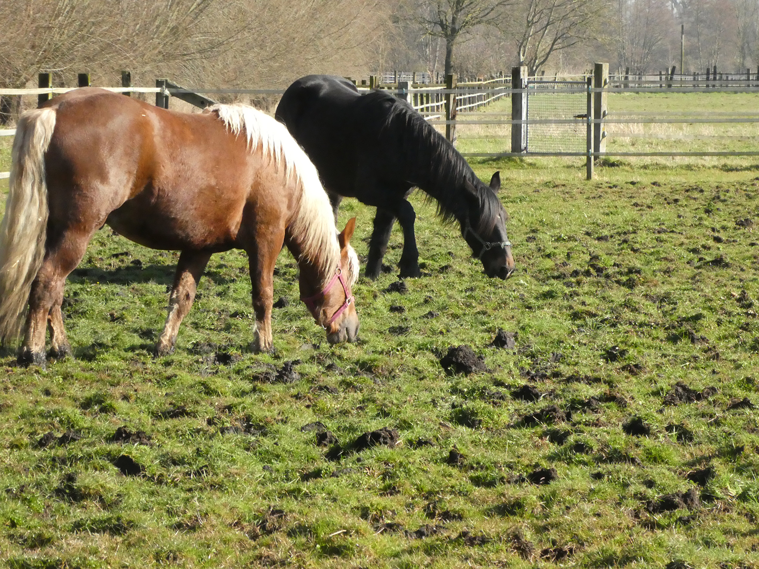Unser 2-jähriger Schwarzwälder Hengst „Draco Star v.L.“ mit seinem Kumpel „Ferdinand“ genießen lange Tage auf der Weide.Abends geht es ab in den Stall zum Heuknabbern.